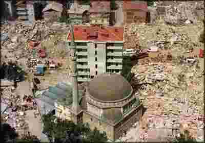 A mosque still stands amidst the rubble of collapsed buildings in this areal view of a neighborhood in the western Turkish town of Golcuk, 60 miles east of Istanbul, August 19 1999.
